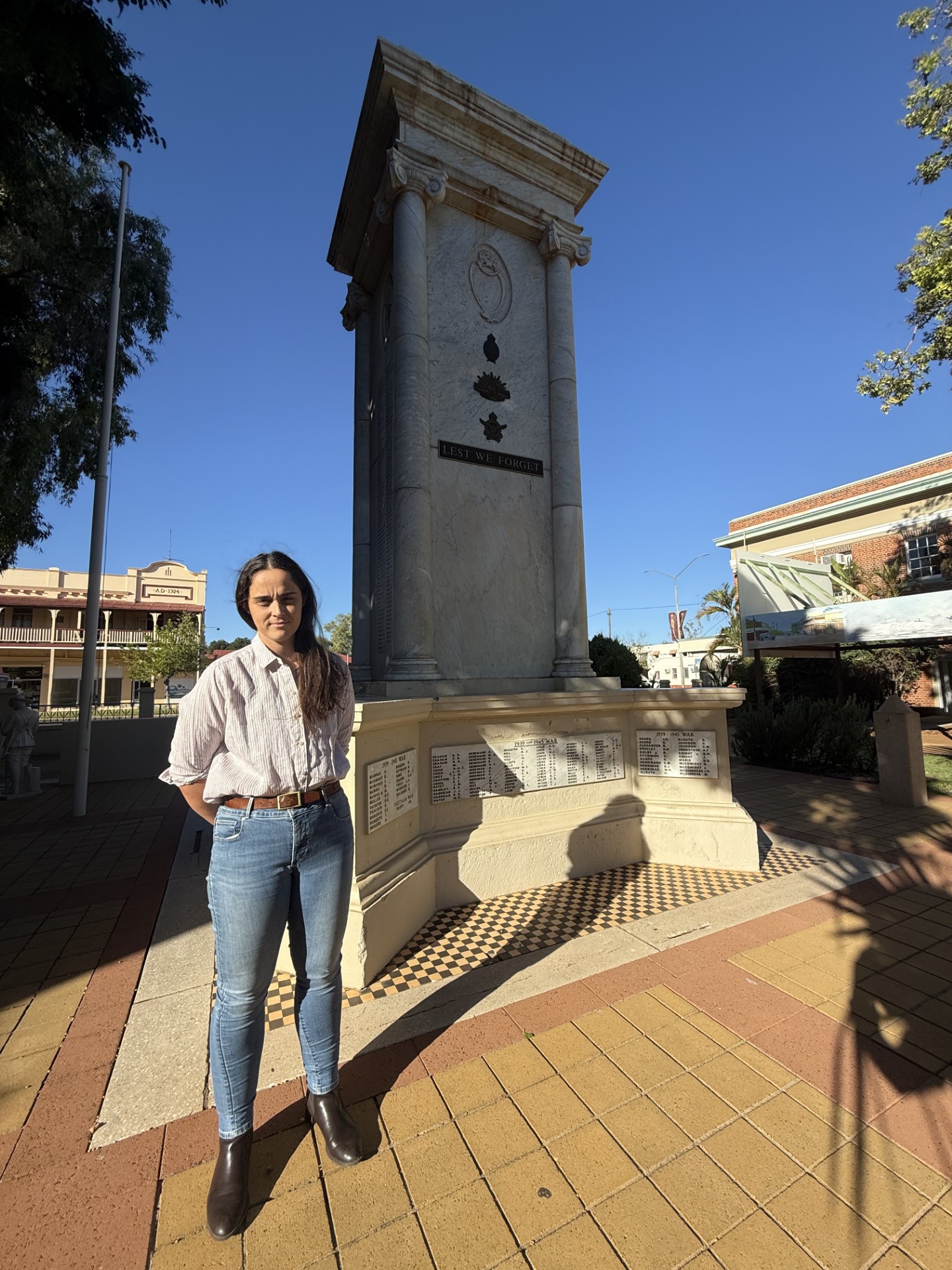 PHOTO: Emily Feldmeier outside Charleville’s war memorial on the eve of Anzac Day.